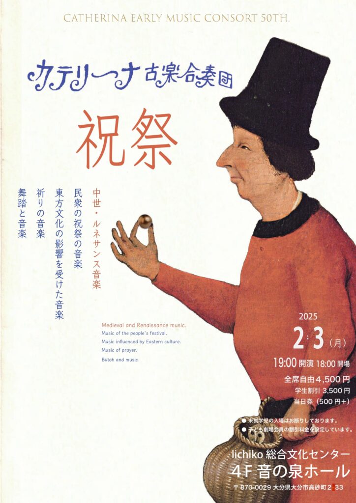 今月初頭、カテリーナ古楽合奏団の九州ツアーが行われた。演奏会のタイトル「祝祭」には、当合奏団の創立50周年というメッセージも込められる。この国における「古楽黎明期」から現在まで、数知れぬ公演を通して間違いなく古楽界の発展の一翼を担って来た団体で、私も幼少のころに「子ども劇場」のイベントの中で彼らの音を聴いた記憶がある。その当時はよもや将来自分もその中の楽器の一つを専門に演奏することになるとは夢にも思っていなかったわけだが。。