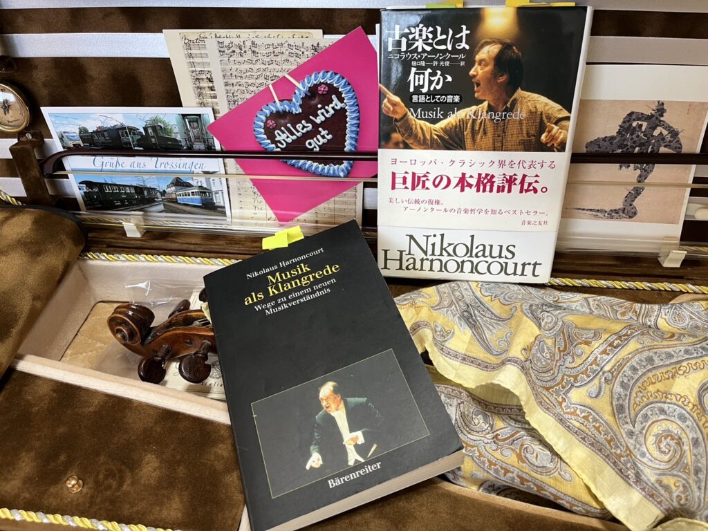 私が古楽に興味を持ったのは、バッハの無伴奏曲を演奏するにあたり様々な文献を読んでいた20代前半です。オーストリアのヴィオラ・ダ・ガンバ奏者であり指揮者としても活躍したニコラウス・アーノンクール(1929~2016)著「古楽とは何か」との出会いに始まります。古楽的な演奏解釈のヒントを得て、目から鱗のような発見も多く、知れば知るほど新鮮で奥深い古楽の世界観に魅了されてしまいました。