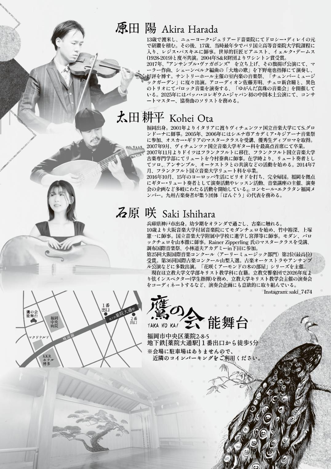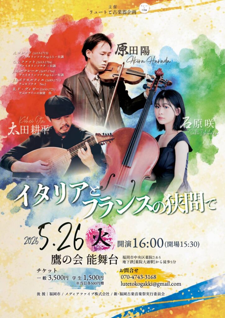 次世代を担うヴァイオリニスト、原田陽とチェロの石原咲、そしてリュートの太田耕平のトリオが再び福岡でお届けする演奏会。