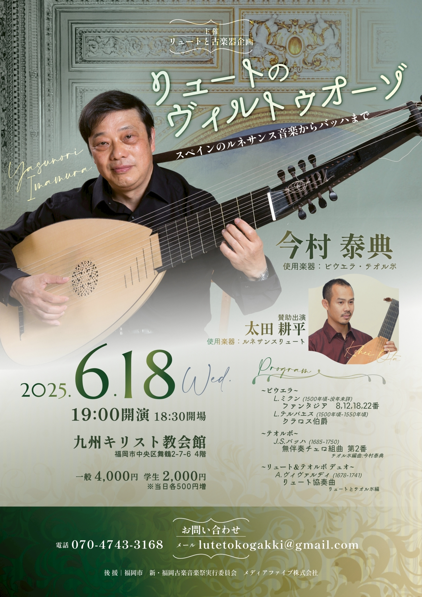 太田耕平プロデュース、「リュートと古楽器企画」2025年のイベントは、スイス在住のリュート奏者、今村泰典氏を招いての演奏会。