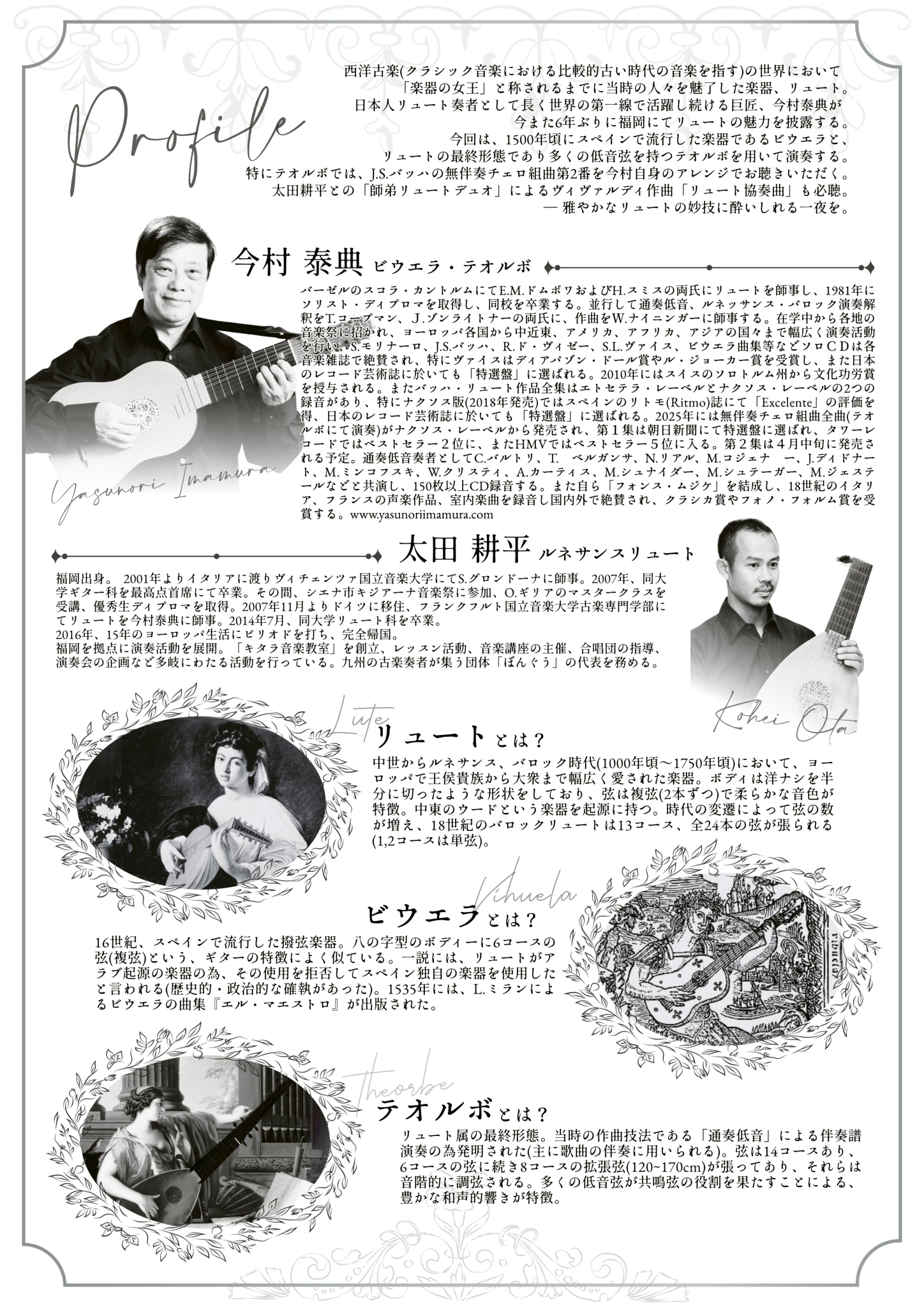 西洋古楽(クラシック音楽における比較的古い時代の音楽を指す)の世界において「楽器の女王」と称されるまでに当時の人々を魅了した楽器、リュート。日本人リュート奏者として長く世界の第一線で活躍し続ける巨匠、今村泰典が6年ぶりに福岡にてリュートの魅力を披露する。今回は、1500年頃にスペインで流行した楽器であるビウエラと、リュートの最終形態であり多くの低音弦を持つテオルボを用いて演奏する。特にテオルボでは、J.S.バッハの無伴奏チェロ組曲第2番を今村自身のアレンジでお聴きいただく。
